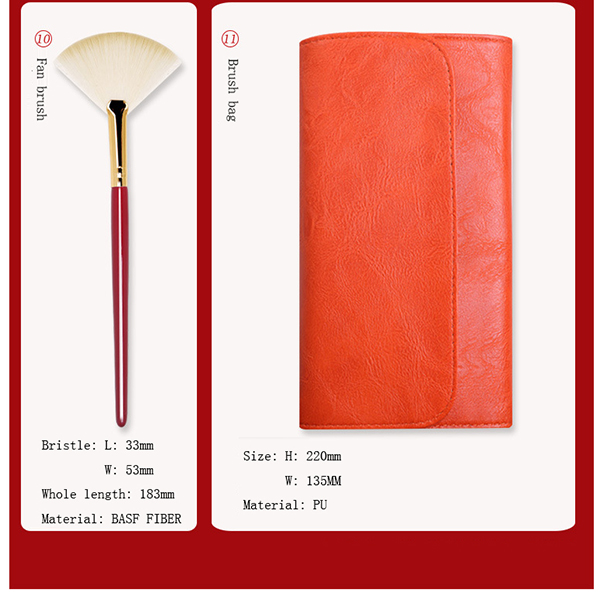 Brushes set: Round powder brush, Blush brush, Concealer brush, Eye shadow brush, Eye blend brush, Define brush, Concealer brush, Pencil, Eye brow brush, Mini fan brush