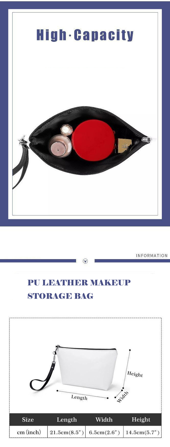 3. Fashional Design:Classical Trapezoid shape with reasonable capacity.One main compartment can fulfill your daily needs for holding your make up items brushes, cream, lipstick etc.