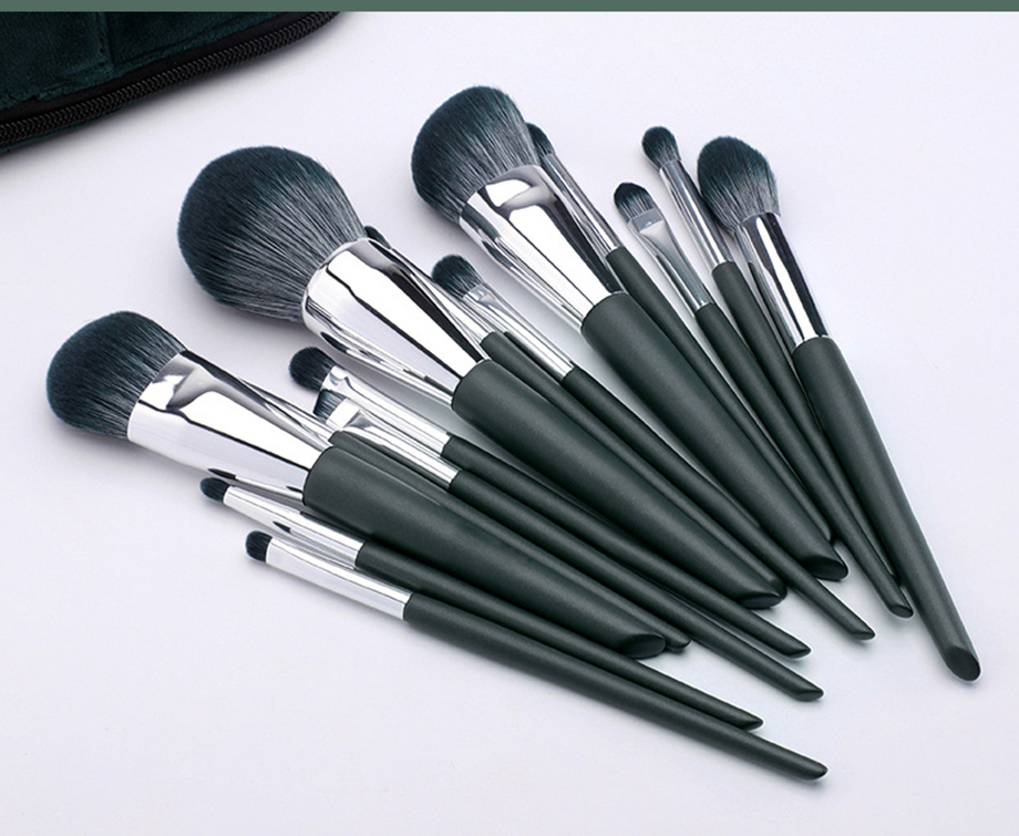 Factory New High Quality 14 PCS Green Color Makeup Brush Sets Vegan Nutral Hair Cosmetic Tool with Cloth Bag