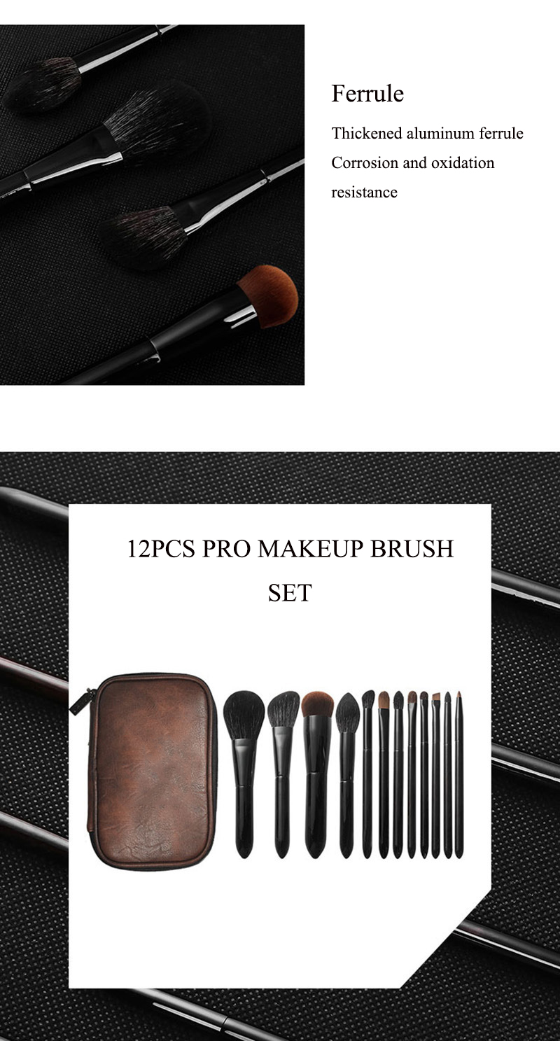 Matte Black Makeup Brush Set 12PCS Professional Natural Synthetic Hair Kabuki Foundation Blending Brush