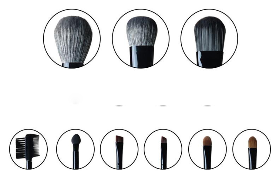 kabuki brush; Flat top foundation brush; Multi-function brush; Precision crease brush; Blender brush; Small lip brush; Flat angled foundation brush; blending eye brush; Angled shading brush;